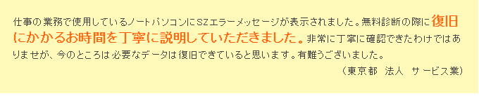 | お客様の声 | 購入して約1年半しか経過していませんが、ハードディスクが壊れるものだとは思いもしませんでした。 研究資料の写真やまとめたパワーポイントのデータが入っていて、バックアップもなかったため、復旧してもらい非常に助かりました。 |